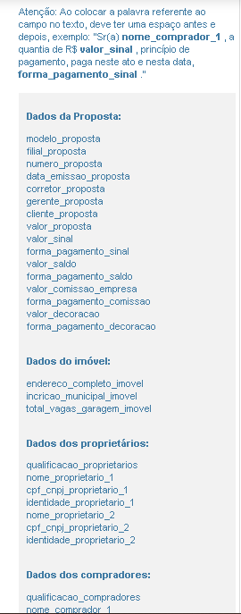 Atenção: Ao lado direito do texto o sistema apresenta as variáveis que devem ser utilizadas. Na hora da impressão essas variáveis serão alteradas pelos dados da proposta.