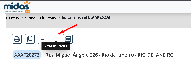 - No imóvel desejado abra a Edição ou Detalhamento e clique em Mudança de status.