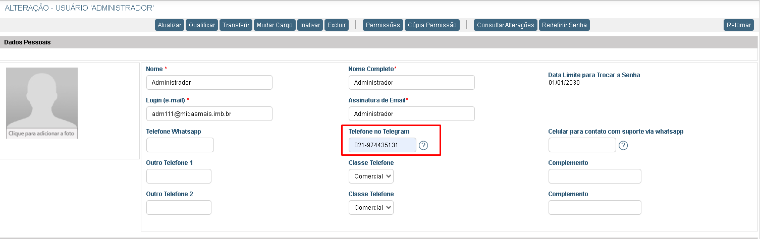 No cadastro de usuários foi criado o botão: Telefones Telegram.