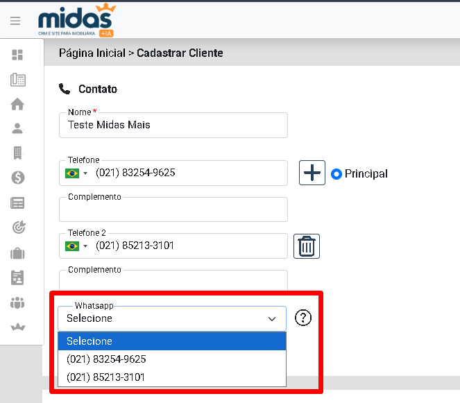 Se cadastrar mais de um número de telefone, selecione aquele que será utilizado para o envio de mensagens via WhatsApp.