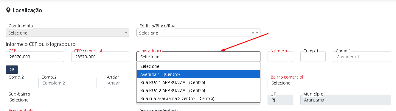 Após inserir os Logradouros do Município, ao digitar o CEP no cadastro de imóveis, no campo Logradouro será solicitada a seleção do Logradouro para cadastrar o imóvel.