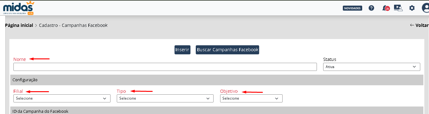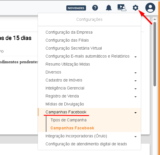 - Acesse Configurações > Campanhas Facebook > Campanhas Facebook.