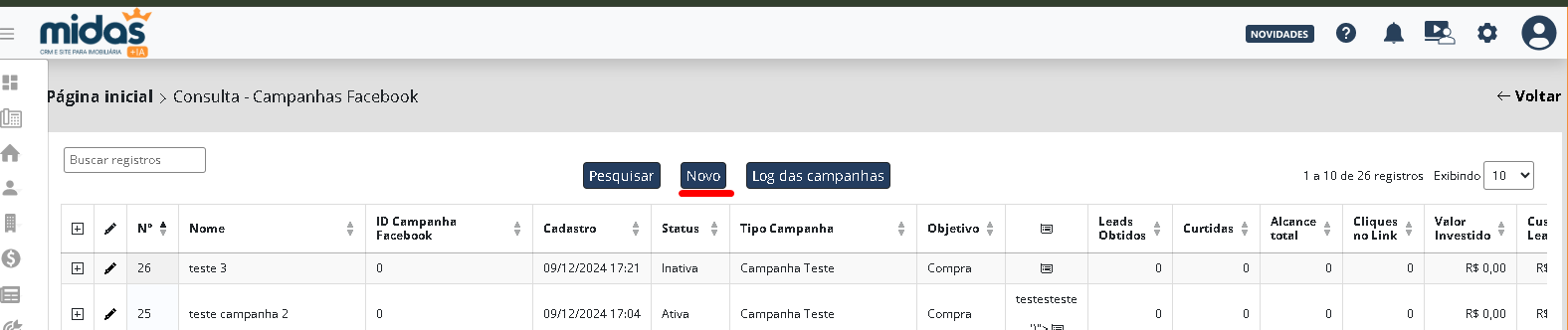 Atenção: As informações que apresentam um asterisco (*) são de preenchimento obrigatório, enquanto as demais são de preenchimento opcional. - Clique em Novo;