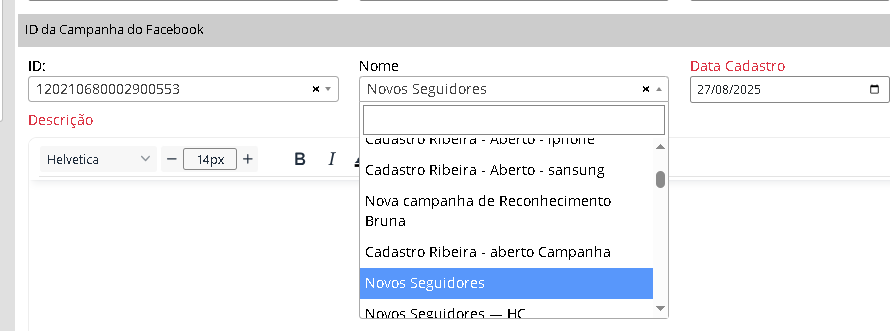 Na seção “ID da Campanha do Facebook”, ao selecionar o ID desejado, o campo “Nome” será preenchido automaticamente, facilitando a identificação da campanha vinculada ao ID escolhido
