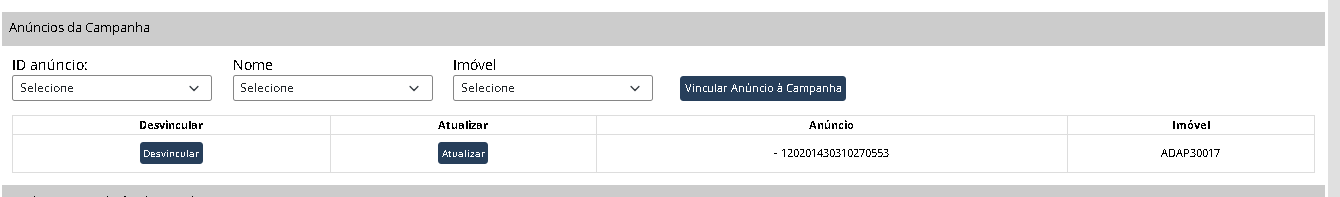 Após essa ação, será exibido na tela o campo “Anúncios da Campanha”. Caso a campanha possua anúncios vinculados, eles serão listados para seleção, permitindo que o usuário associe o imóvel correspondente ao anúncio.