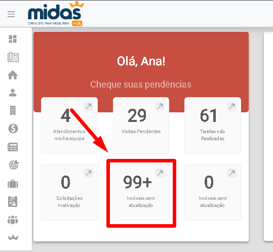 Na Página Principal do sistema, no item Pendências > Opções sem atualização é exibida a quantidade de imóveis que tiveram a data de atualização cadastral excedida, caso a empresa esteja configurada para usar a Periodicidade para Atualização das Fichas Cadastrais.