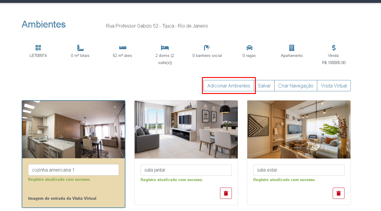 - Caso você identifique que está faltando a foto de algum ambiente, ela pode ser adicionada clicando no botão Adicionar Ambientes.