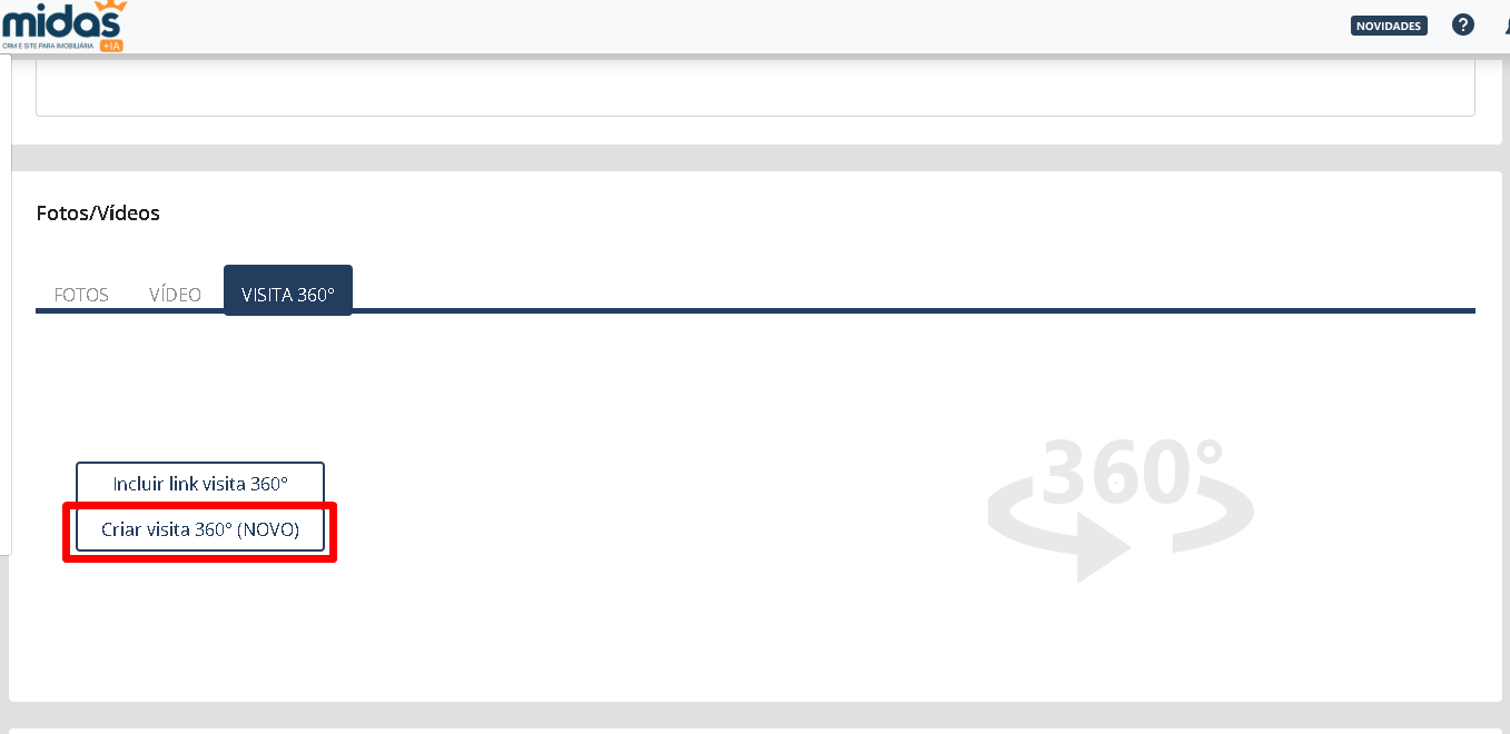 - Clique no botão Criar visita 360° (NOVO);
