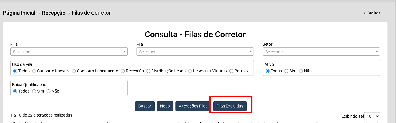 Ao clicar neste botão, será exibida uma listagem com todas as filas que já foram excluídas, permitindo auditoria e acompanhamento das alterações realizadas.