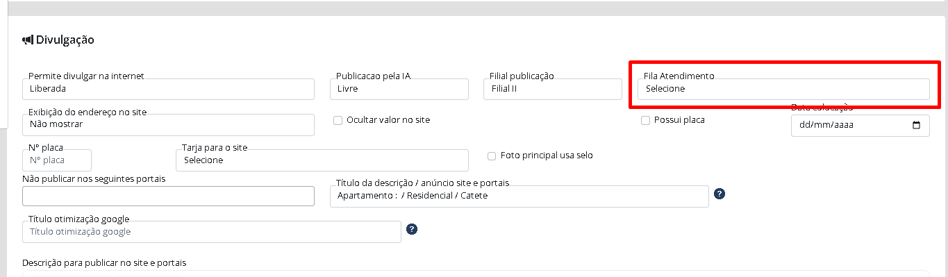 Vá até a aba ‘Divulgação’ e localize o campo “Fila Atendimento”