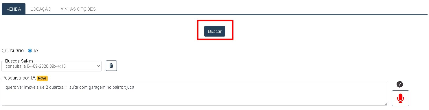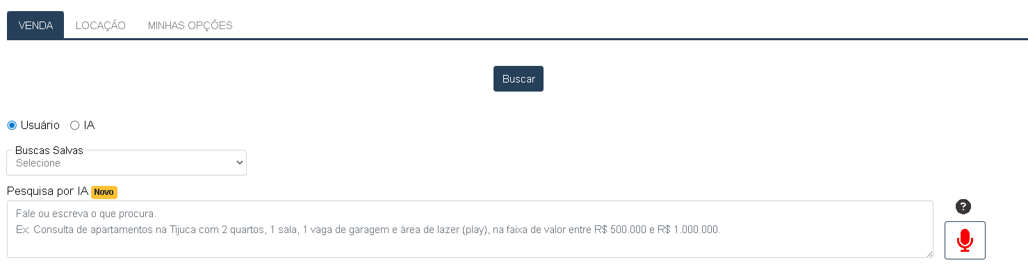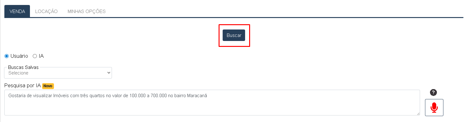 Clique no ícone do microfone e fale as características do imóvel que deseja visualizar. Ao finalizar, clique no ícone vermelho de ‘Stop’.