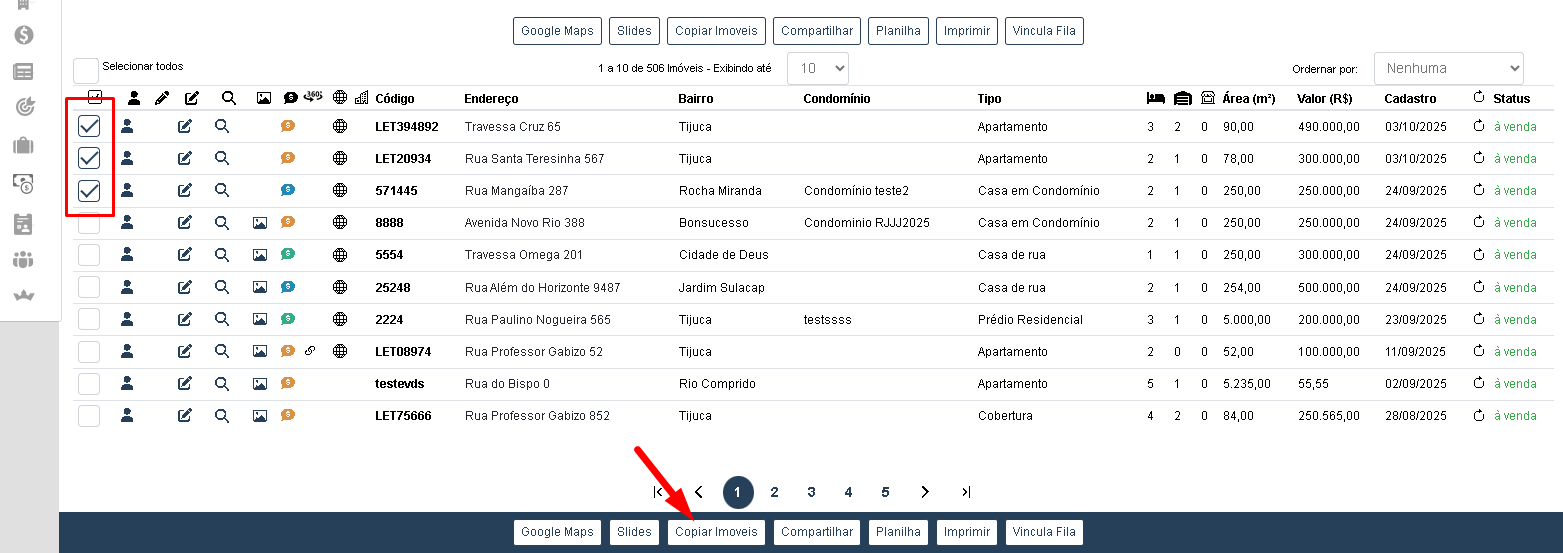 Na consulta de imóveis, selecione os imóveis que o usuário deseja copiar para outra filial de publicação.