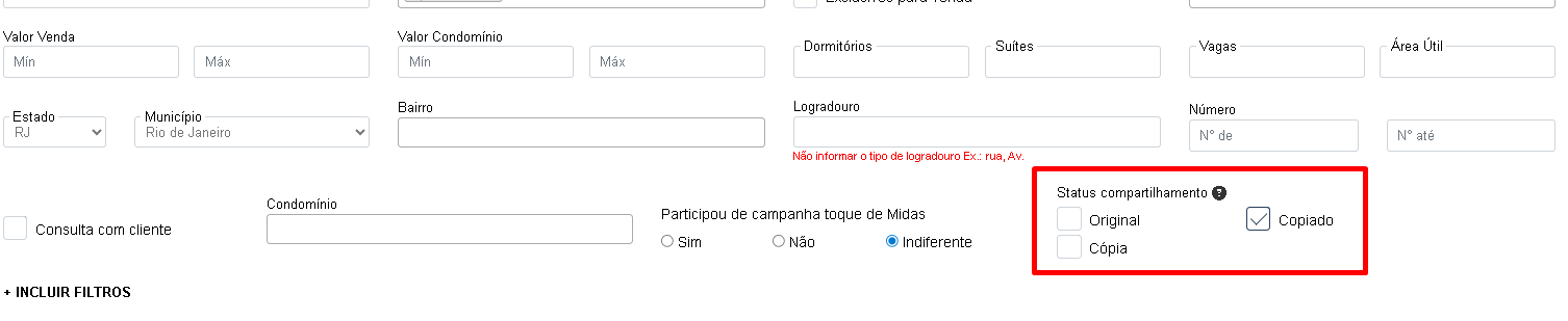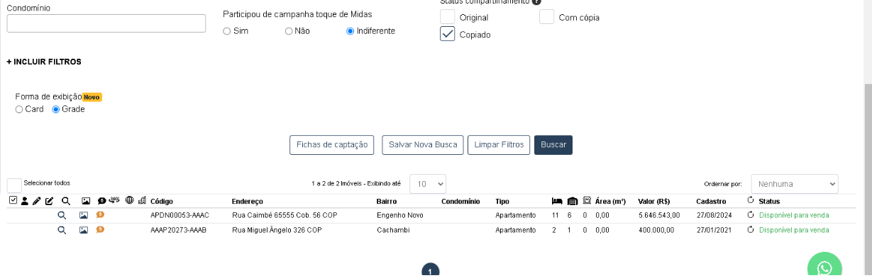 Logo, para visualizar os imóveis copiados, selecione a opção “copiado” no campo “status compartilhamento” na consulta de imóveis.