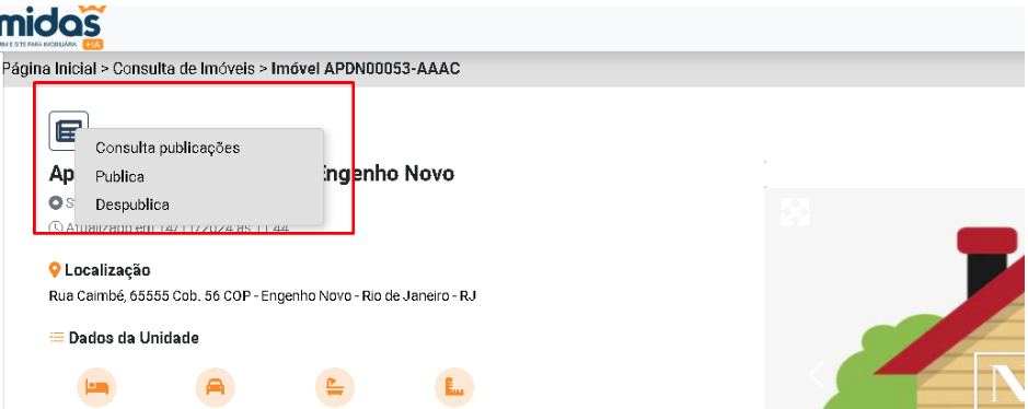 No detalhamento, haverá um ícone na parte superior esquerda, onde os usuários poderão visualizar os portais em que o imóvel está publicado, além de ter as opções de publicar ou despublicar o imóvel.
