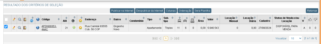 Selecione o imóvel e clique em “publicar na internet”.