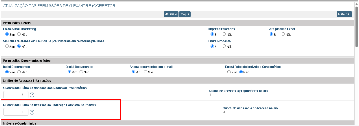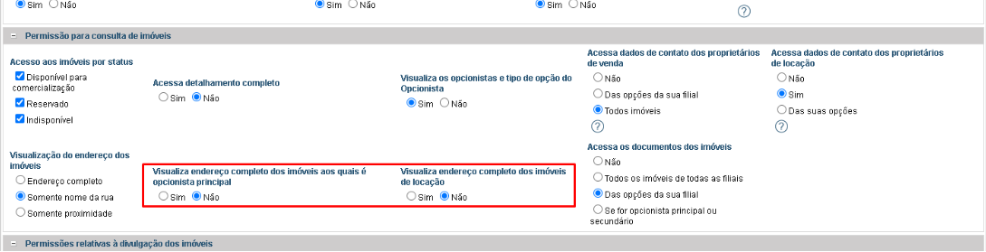 Além disso, é possível definir se o usuário poderá visualizar o endereço completo dos imóveis em que é o opcionista principal. Mesmo que a permissão geral de “visualização dos endereços dos imóveis” esteja definida como “somente rua”, pode-se permitir que ele visualize o endereço completo apenas de suas próprias opções.