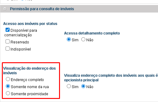3. A permissão ‘Visualização do endereço dos imóveis’ precisa estar como “Somente nome da Rua”;