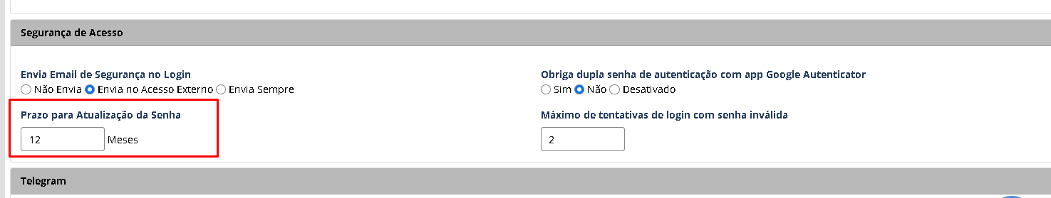 Configurações > Configuração da Empresa > Bloco Segurança de Acesso > Prazo para Atualização da Senha