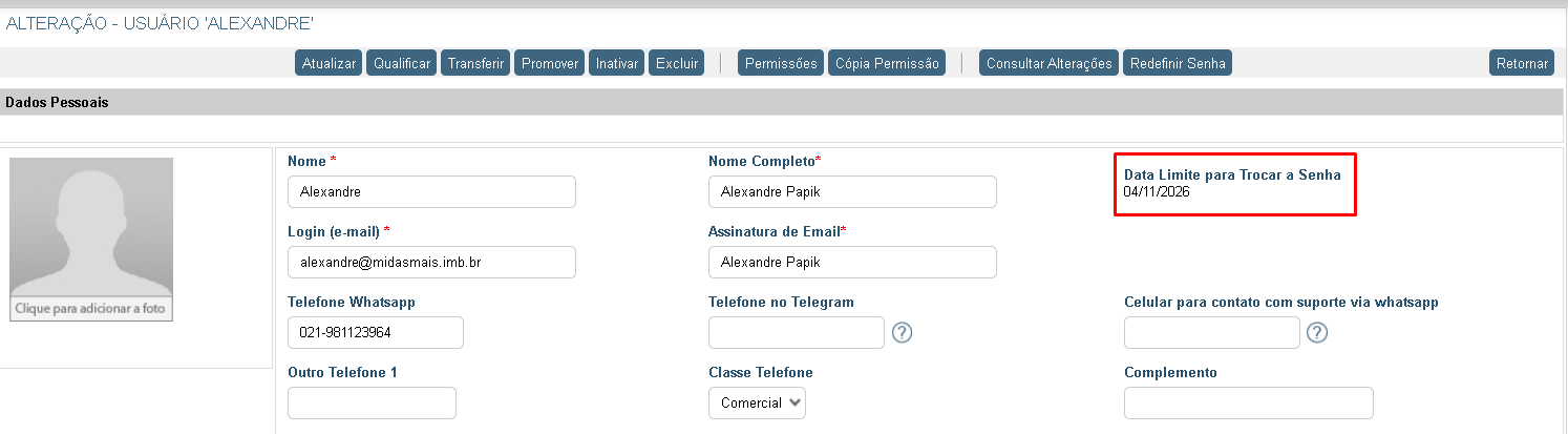 Para que o usuário tenha ciência sobre o prazo para atualização da senha de acesso ao Midas, criamos o campo ‘Data Limite para Trocar a Senha’.