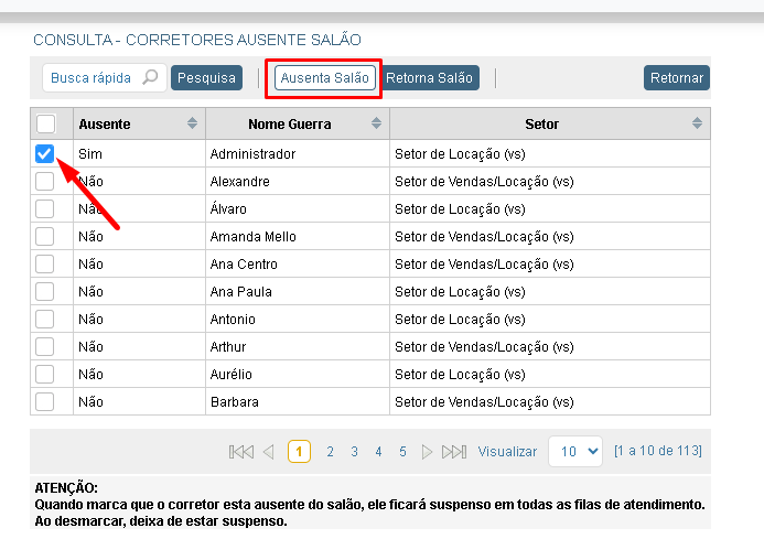 Com essa função ativa, será disponibilizado o botão ‘Ausência Salão’ na recepção, permitindo ausentar um corretor que não esteja presente na imobiliária. Ao ser ausentado, o corretor será suspenso de todas as filas de plantão, e os novos leads serão direcionados aos demais corretores da fila, mesmo quando o envio estiver configurado para o opcionista principal.